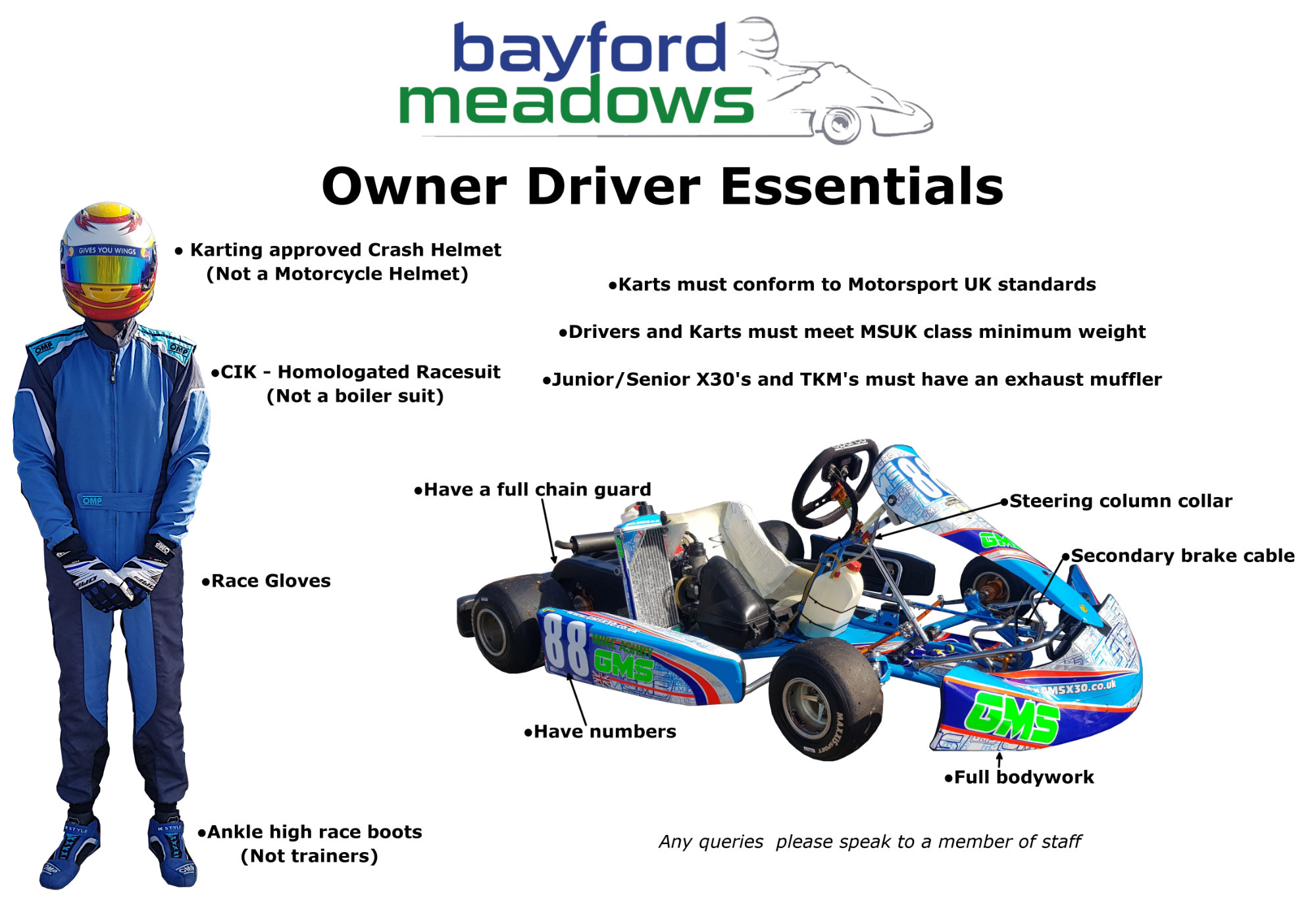 Racewear - In order to practice, drivers must wear approved racesuit, a pair of race gloves, a MSUK karting helmet and ankle high raceboots. We are unable to provide these items.